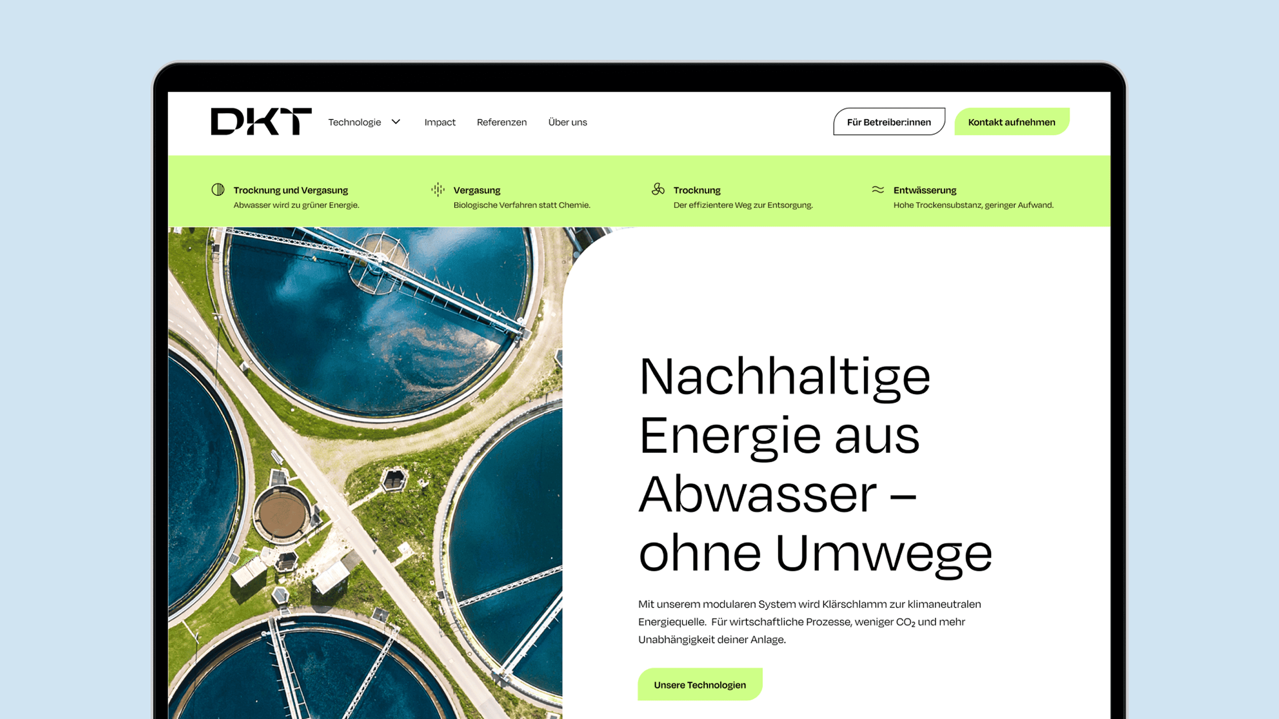 Bei DKT trifft praxiserprobte Technologie auf Vision. Doch um Märkte zu erobern, muss die Technik für Entscheider:innen nachvollziehbar sein. Für die modularen Anlagen von DKT, die Klärschlamm direkt vor Ort in Energie und Rohstoffe verwandeln, zeigen wir, wie das geht: mit Fokus auf die Wirkung statt auf bloße Technik.